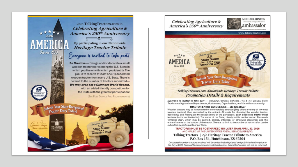 “It’s about preserving meaning—Inspiring others to connect with their agricultural roots and ensure that families and communities remain anchored in the values that built this nation. Talking Tractors exists for the spirit of Rural America, to safeguard history for future generations, and to serve as a steward of this Country’s agricultural soul.”